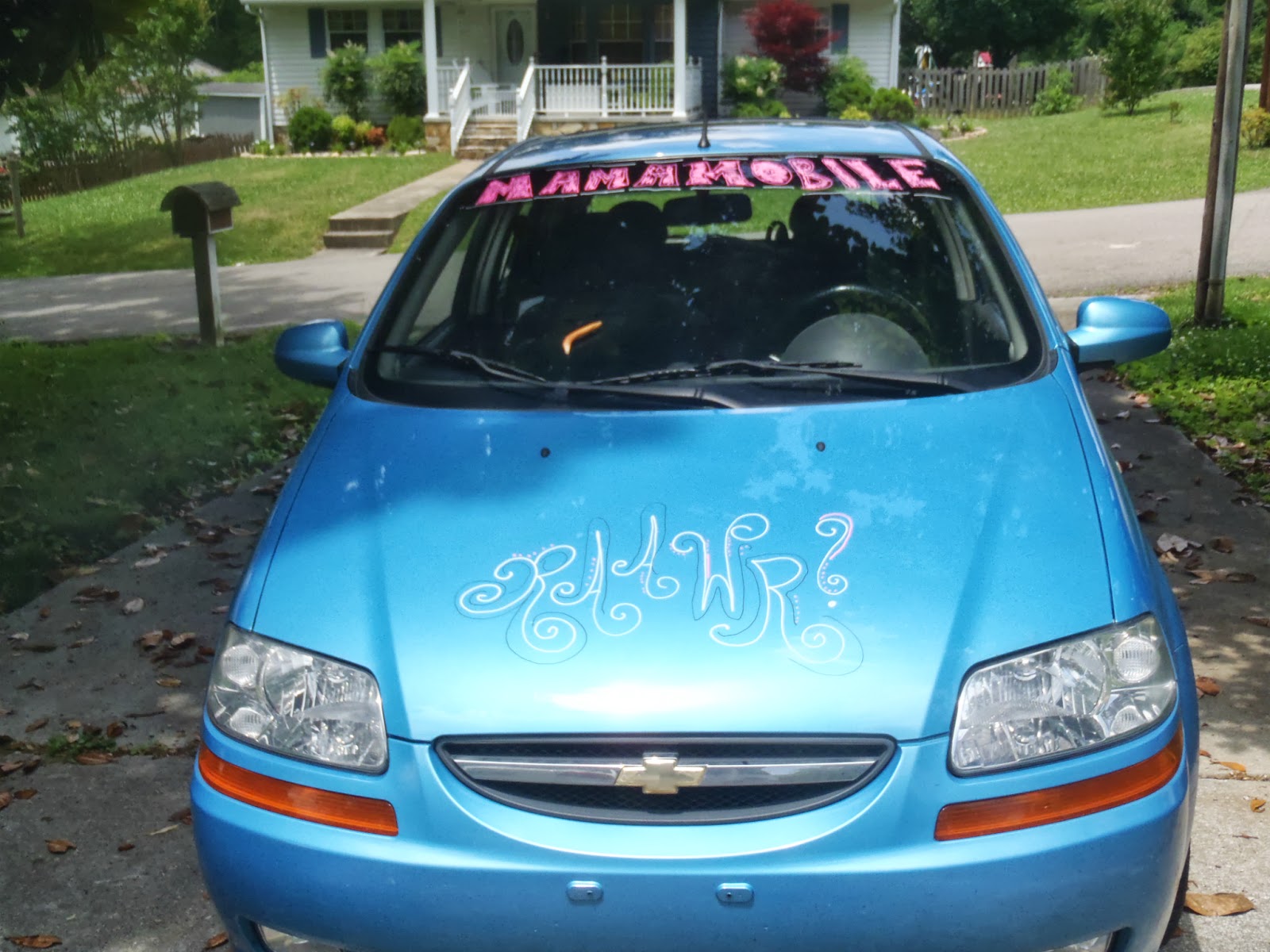 Last Friday the adventure started. My car is starting to wear (the check engine light has been on for five years, no joke) so I asked Mama to borrow her car to take the trip out of town. Once the Mamamobile was acquired, I trotted out to Amber's house, and we gussied up the Mamamobile in style.